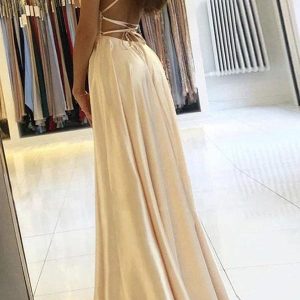 This elegant A-line satin gown is ideal for any formal event. It boasts a modest design and is crafted from satin, complete with a subtle skirt split that adds a touch of sophistication. Prepare to captivate with this chic and timeless ensemble that guarantees to make a lasting impression.